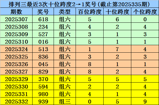 第2025307-第2025309期奖号:618、234、527,其下期奖号为:016,首位号码跨度为5;