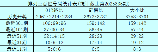 上期回顾:排列三第2025335期奖号为:276。奖号形态组六,大小比2:1,奇偶比1:2,012路1:1:1。