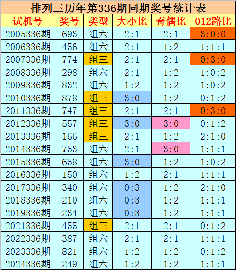 组选类型推荐:历史上排列三第336期同期奖号中,组六出现13期,组三出现6次,今年第336期预计奖号为组六号码。