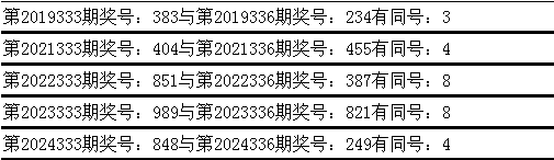 与前期历史同期奖号对比分析,在最近五年开奖中,第333期同期奖号与第336期同期奖号都出现了相同号码: