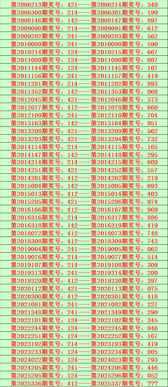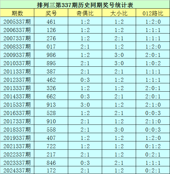 排列三第2025337期开奖日期:2025年12月17日,历史上第337期已开出了19次奖号,历年同期号码分别为:461、126、276、017、986、895、387、462、326、662、913、528、910、558、407、722、217、846、172。