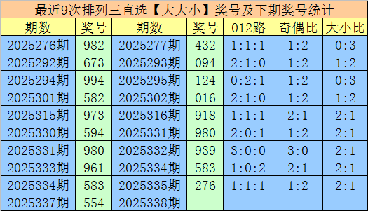 1.排列三第2025337期奖号开出554,大小直选分布为:大大小,在历史开奖中直选【大大小】分布已开出912期,在前9次直选【大大小】分布中,出现奖号为:982-673-994-582-973-594-980-961-583,组三开出1期,组六开出8期。