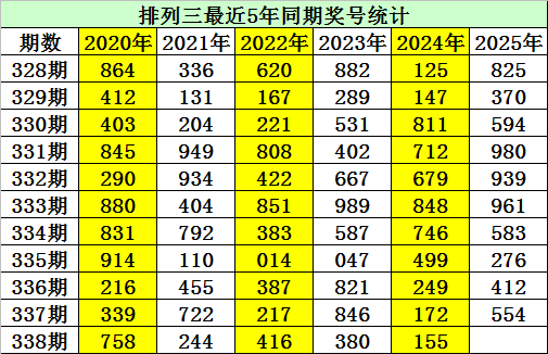 上期回顾:排列三第2025337期开奖:554,质合比为2:1,奇偶比为2:1,大小比为2:1。