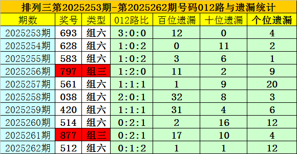 开奖回顾:排列三第2025262期奖号为:512,类型为组六,号码012路比为0:1:2,百十个位号码直选分别遗漏1期、1期和12期。