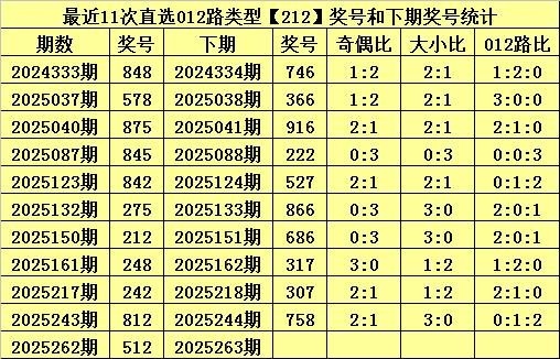 排列三上期开出奖号为:512,其直选012路类型为212,历史上直选212号码已开出了206次,最近11期分别开出奖号为:848、578、875、845、842、275、212、248、242、812、512。