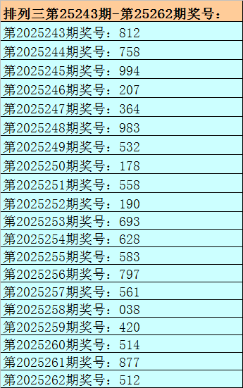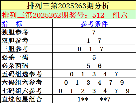 1.排列三最近十期分别开出号码:693-628-583-797-561-038-420-514-877-512,其中有5期奖号开出了上期的重复号码,本期预计第2025262期奖号:512中有重号,参考号码:1。