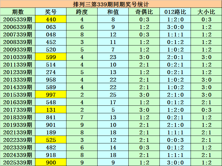 上期回顾:排列三第2025339期奖号为900,组选类型为组三,奖号大小比为1:2,012路比为3:0:0,奇偶比为1:2。