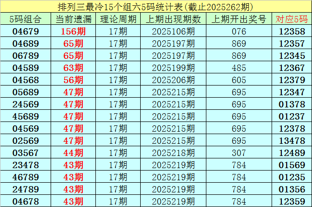 (5)排列三目前遗漏值最大的5码组六组合为:04679,本期遗漏156期,短期解冻的可能性较小,则25263期奖号分布在04679-12358之中的可能性最大。