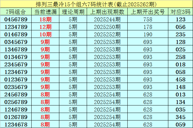 (1)在排列三已开出的7386期奖号中(统计截止第2025262期),目前7码组六遗漏值最大的组合为:0456789,本期遗漏18期;