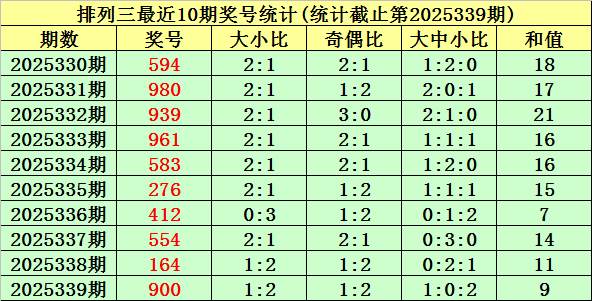 上期回顾:排列三第2025339期奖号为:900。奖号类型:组三,和值:9,奇偶比:1:2,跨度:9,大小比:1:2。