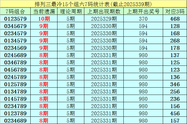 (1)在排列三已开出的7463期奖号中(统计截止第2025339期),目前7码组六遗漏值最大的组合为:0123579,本期遗漏10期;