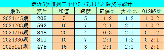 1、排列三前两期个位分别开出号码5和7,历史上个位号码连续两期分别出现5和7时,共有72次。在最近5次出现时,其下期分别出现号码:205、592、848、811、475;