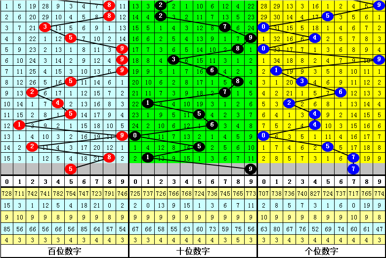 3、在以上0-9号码频次中,号码大小比为32:33,012路比为24:20:21,本期预计百位开出2路号码,参考号码5。