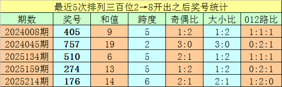 1、排列三最近两期百位号码分别开出2和8,历史上百位号码连续两期分别开出2和8的奖号出现了66期。前五期开出之后其下期奖号分别为:405、757、510、274、176;