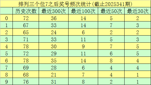 第三位杀号:第三位上期出现奖号7,该位历史上奖号7已开出了717次,最近100次第三位开出7时,下期号码0-9分别落号:号码1、0、6→14次,3、5→11次,4→9次,9→8次,8→7次,2、7→6次。