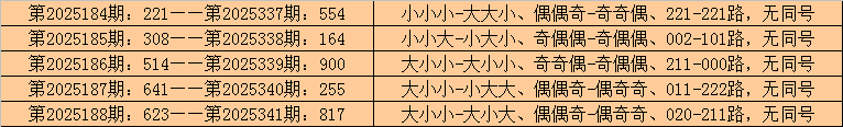 在排列三历史开奖中,第2025184期-第2025188期连续5期奖号为:221-308-514-641-623。