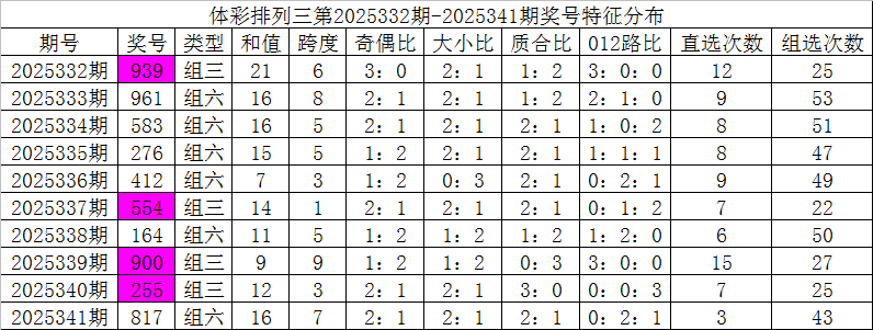 开奖公告:体彩排列三第2025341期开出奖号:817。组六,无重号,奇偶比2:1,大小比2:1,012比0:2:1,和值16,跨度7。
