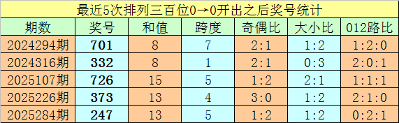 1、排列三最近两期百位号码分别开出0和0,历史上百位号码连续两期分别开出0和0的奖号出现了76期。前五期开出之后其下期奖号分别为:701、332、726、373、247;