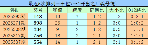 1、最近两期排列三十位号码开出号码分别为7和1,历史上十位号码连续两期同时出现号码7和1的奖号共开出82期。最近五次下期开出号码为:148、898、234、756、554;