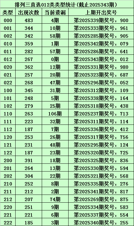 排列三上期开出奖号为:012,其直选012路类型为012,历史上直选012号码已开出了267次,最近11期分别开出奖号为:975、672、948、972、018、375、948、618、918、045、012。