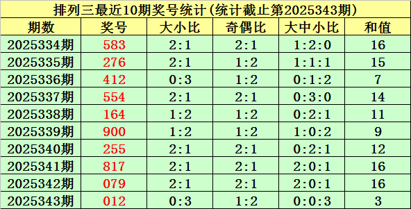上期回顾:排列三第2025343期奖号为:012。奖号类型:组六,和值:3,奇偶比:1:2,跨度:2,大小比:0:3。