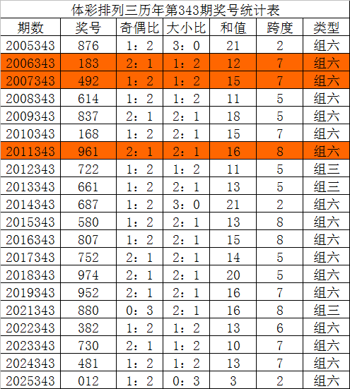 排列三第2025343期奖号为012,奇偶比为1:2,大小比为0:3,和值为3,跨度为2。