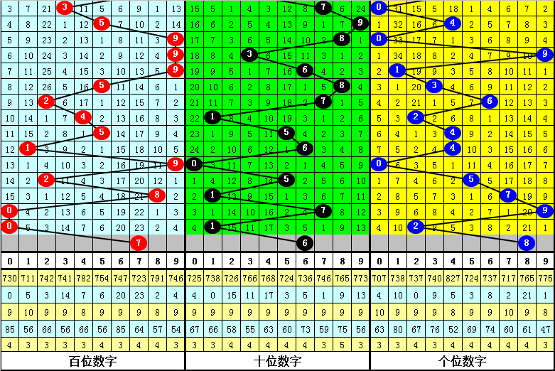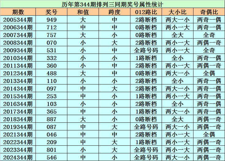 历史上第2025344期排列三已开出19期奖号了,历年同期奖号分别为:949、712、757、070、531、332、360、488、110、097、253、103、365、887、087、046、209、801、546,详细统计见下表: