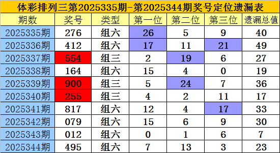 开奖回顾:排列三第2025344期奖号为:495,各位号码遗漏值分别为7、13、3,遗漏总值为23。
