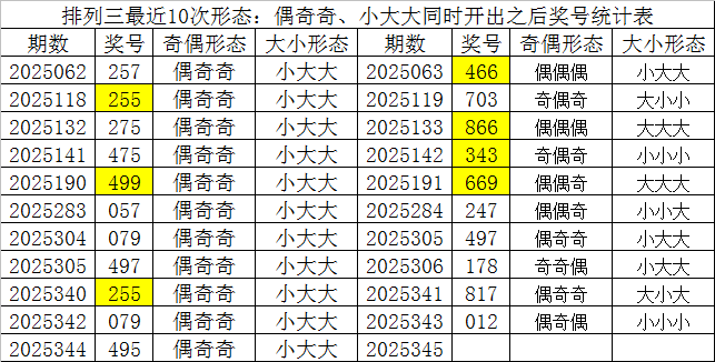 排列三最近10次同时开出奇偶形态:偶奇奇和大小形态:小大大时其奖号分别为:257-255-275-475-499-057-079-497-255-079-495,下期分别开出号码为:466-703-866-343-669-247-497-178-817-012,详细统计见下表: