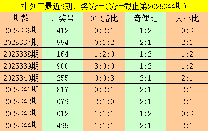 二、体彩排列三前9期奖号开出:412-554-164-900-255-817-079-012-495,其中奖号大小比为12:15,012路比为8:10:9,奇偶比为14:13;