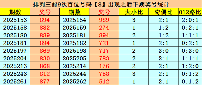百位号码:百位上期奖号为2路、偶数、大号:8,历史上百位号码8共开出782期,前一次开出期数在第2025261期,上期奖号隔5期再次开出。