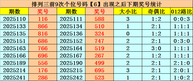 个位号码:上期奖号为大号、偶数、0路号码:6,历史上个位号码6共开出731期,前一次出现在第2025241期,上期遗漏25期再出。