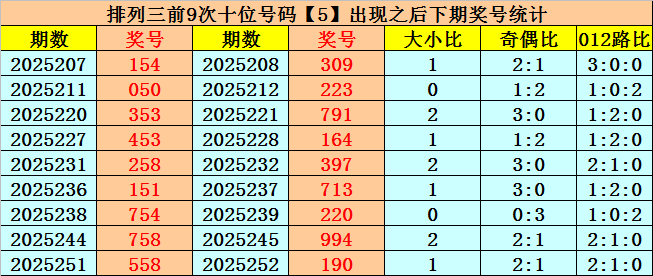 十位号码:十位上期开出偶数、大号、2路号码:5,历史上十位号码5共开出717期,上一次出现在第2025251期,上期奖号遗漏值为15期。