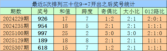 1、最近两期排列三十位号码开出号码分别为9和7,历史上十位号码连续两期同时出现号码9和7的奖号共开出80期。最近五次下期开出号码为:926、954、997、189、618;