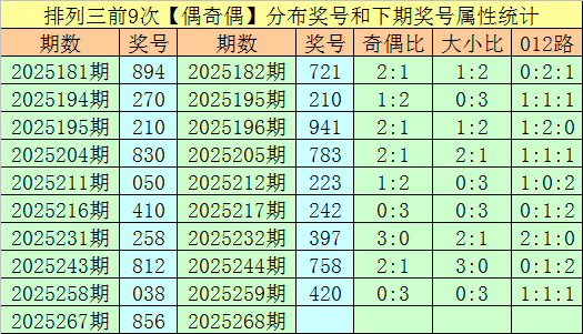 在最近9期开出奇偶分布:偶奇偶的奖号为:894-270-210-830-050-410-258-812-038,在下期出现号码分别为:721-210-941-783-223-242-397-758-420。其中百十个位号码分布情况如下: