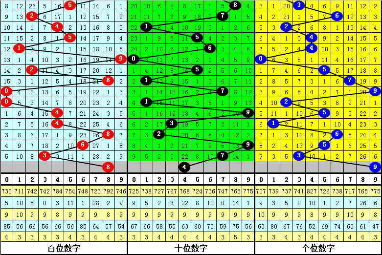 百位分析:该位上期奖号为3,出现0路、奇数、小 号,在前11期奖号,该位012路比为5:3:3,012路号码出号相当,目前012路号码遗漏期数分别为0、3和2,近期百位注意2路号码走热。