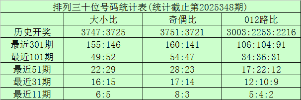 在连续11期奖号中,该位012路比为5:4:2,2路号码较少,目前012路号码遗漏期数分别是:1期、0期和2期,本期预计出现1路奖号。