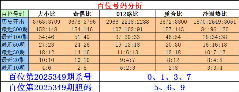 排列三百位第2025349期杀号:0、1、3、7