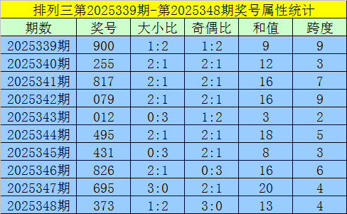 上期回顾:排列三第2025348期出现奖号373。开出组三,奇偶比3:0,012路比2:1:0,大小比1:2,和值13,跨度4。