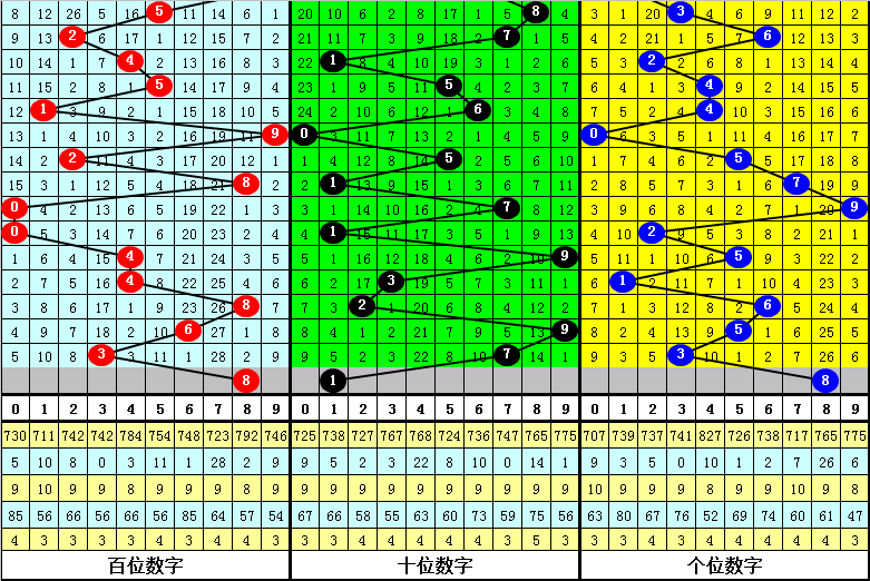 十位:上期为7,近10期012路比为4:4:2,其中1路号遗漏4期出现,本期注意1路号再出,参考1。