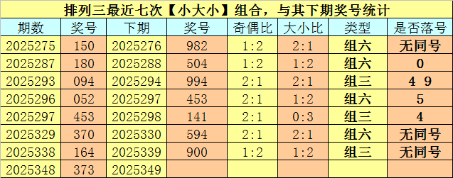 大小分析:排列三上期开出号码373,大小类型为【小大小】,最近七次开出大小类型小大小的奖号分别为:150、180、094、052、453、370、164,其下期分别开出号码:982、504、994、453、141、594、900。其中号码大小比为9:12,大小 号码开出比例基本相等,本期预计小 号转热,关注大小比1:2。