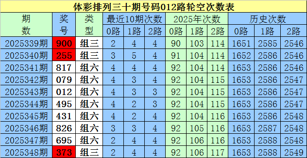 开奖回顾:排列三第2025348期奖号为:373,号码012路比为2:1:0。