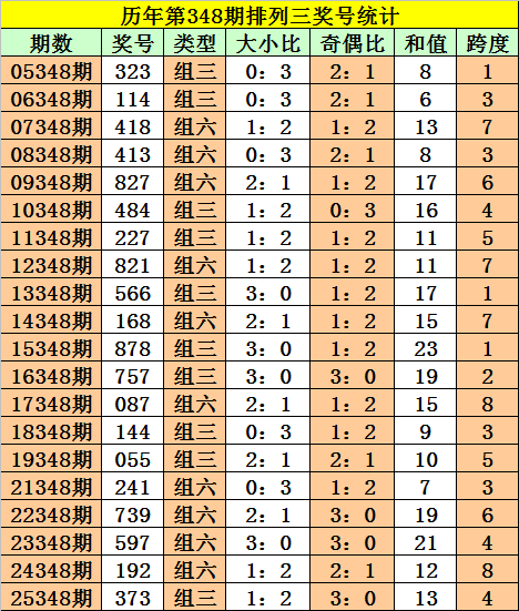 排列三第2025348期奖号:373,和值13,跨度4,大小比1:2,奇偶比3:0。