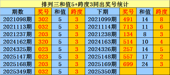 上期回顾:排列三第2025349期奖号:032。和值5,跨度3。