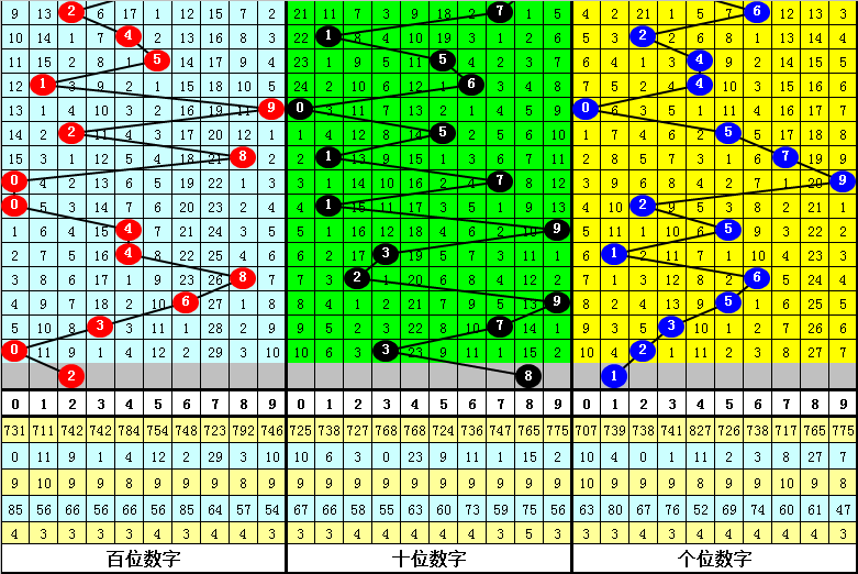 3、在以上0-9号码频次中,号码大小比为27:40,012路比为29:22:16,本期预计百位开出2路号码,参考号码2。