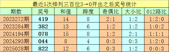1、排列三最近两期百位号码分别开出3和0,历史上百位号码连续两期分别开出3和0的奖号出现了68期。前五期开出之后其下期奖号分别为:419、382、078、044、822;
