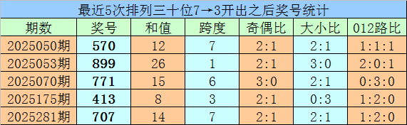 1、最近两期排列三十位号码开出号码分别为7和3,历史上十位号码连续两期同时出现号码7和3的奖号共开出72期。最近五次下期开出号码为:570、899、771、413、707;