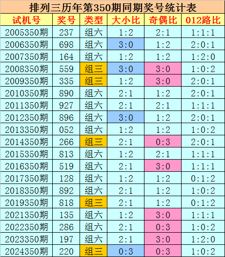 组选类型推荐:历史上排列三第350期同期奖号中,组六出现14期,组三出现5次,今年第350期预计奖号为组六号码。