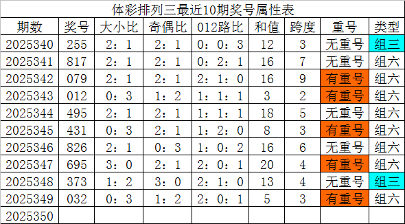 体彩排列三最近10期分别开出奖号:255、817、079、012、495、431、826、695、373、032,各奖号属性详见下表: