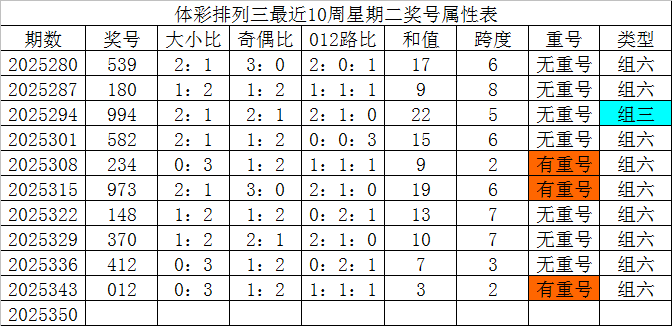 体彩排列三最近10周星期二奖号分别为:539、180、994、582、234、973、148、370、412、012,各奖号属性详见下表: